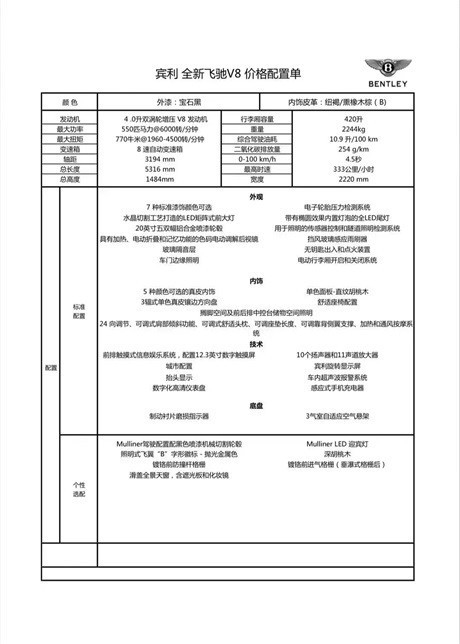 选配:穆勒配置配22寸黑色喷漆机械切割轮毂,照明式飞翼“B”字形徽标 - 抛光金属色,镀铬前防撞杆格栅,镀铬进气格栅(垂瀑试格栅),滑盖全景天窗,含遮光板和化妆镜,Mulliner LED 迎宾灯,3辐式双色加热真皮镶边方向盘,座椅刺绣宾利徽章(反衬色)。