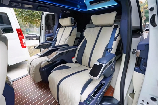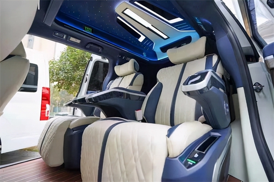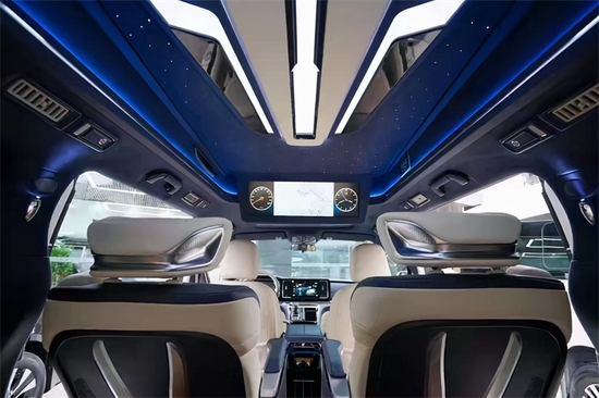 第三排采用的也是电动沙发座椅的设计,支持180度放平成床!豪车该有的功能都应有尽有,顶部运用高级麂皮绒全包覆以及极夜之光造型顶灯的设计,其豪华商务车的气质凸显无疑。