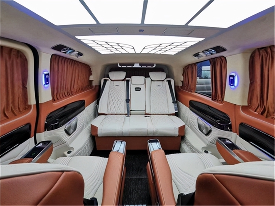 顶部搭配层次分明的光纤灯,配上繁星点点的满天星和横条灯带,即梦幻又高级。一切的搭配都只是为您展示这款奔驰威霆巴赫版的奢华与不凡。同时本款威霆高顶7座高端私人定制改装商务车,不仅在视觉上还是触觉上都能让乘坐者感到身心愉悦。奔驰威霆升级后的第三排是七座车型的第三排电动沙发座椅,支持180°放平,随时为您的长途出行打造足够宽敞舒适的卧铺,威霆车内简约时尚的氛围灯与豪华马毛地板交相辉映,是对精致移动生活的奢华追求。