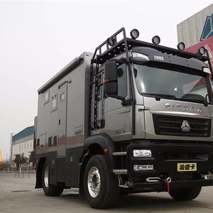 越野专用方舱造型,三点悬浮设计,保证车厢稳定性的同时也防止意外变形,地板及家具异响,极大延长箱体使用寿命。底盘方面,前后悬挂采用前后专用板簧+液压筒式减震器的组合形式,其作用可过滤行驶途中的颠簸感也保证了舒适性;三把差速锁也让它对于任何路况都可从容不迫的通过,提升了户外越野的生存性。轮胎规格为425/65 R22.5。