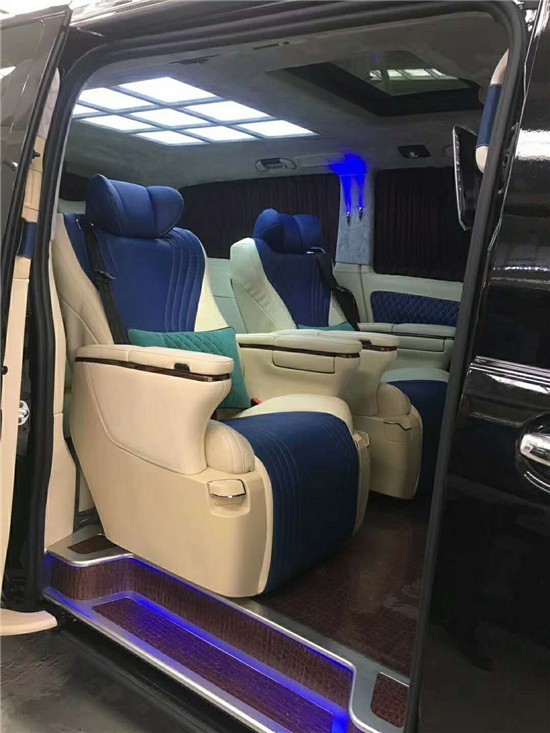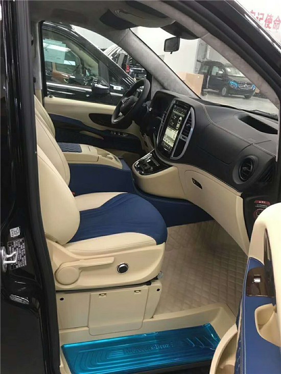 奔驰威霆改装最舒服的座椅:奔驰威霆乘客舱第二排多功能航空座椅,可旋转,并带有脚托功能,舒适乘坐,附有加热、通风、电动调节、腿托、按摩、记忆、电动头枕、电动靠背、电动肩部支撑等功能,座椅支持180度旋转。此款奔驰威霆第二排与第三排之间有可拆卸便捷式商务桌板,可进行商务洽谈,商务洽谈可放置电脑、文件等物品,旅游无聊时打娱乐,使用方便快捷。