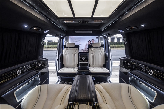 奔驰V260L改装版四座商务车第二排则为隐藏式座椅,可根据用车需求一键开合,收起时就会变成豪华吧台,科技感十足!两个奔驰GLS450 (配置|询价)的秘书座椅座椅,可电动语音识别进行收回,展开