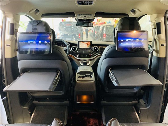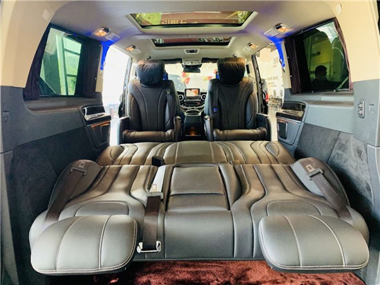新款奔驰V260 (配置|询价)L改装后还配有车厢内的灯光设备,按下按钮,车厢内顿时充满了黄色的炫彩灯光气氛以及漫天星晚上给人看星星的感觉。中控安装了14.1寸显示屏到时影响更加清晰可见还可以休闲娱乐,以及正副驾驶后面的商务桌板给了商务以休闲的功能,后面两个娱乐显示屏可让乘客更加休闲娱乐,商务人士可在会议过后利用车厢的灯光设备等,顿时让氛围轻松起来,可商务可休闲。吸顶电视设计使得车厢给人娱乐休闲的感觉,满天星顶会让您夜间行车抬头仰望,也让人有浪漫的星空臆想念头。倘若把周围的窗帘都拉开,闭上眼深呼吸,感觉与周围的环境很是融合,给人以心旷神怡的完美感