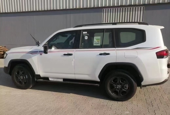 入平行进口市场的是LC300 GR Sport版本,新车所配备的专属运动包围,确实能毫无保留地展现出这款车的霸气感,图中车型是白色车身、黑色中网,所以整个前脸表现得十分有张力。正面上银色金属镀铬条包围着TOYOTA英文字母,且下方挂着红色GR铭牌也表明了自己的身份,增加了自己的辨识度。下包围看上去应该是工程塑料件,越野时更加耐磨,且不容易损坏,配合银色的下护板。