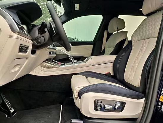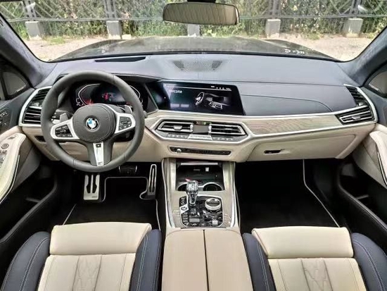 22款宝马X7 XDrive 4.0i 美规M版 碳蓝黑/干邑配置:豪华包 驾驶员辅助包 寒冷包 M运动包 停车辅助包 环影高级科技包(台显 手式控制)M运动套件(22轮 M运动方向盘)暗黑套件 M运动蓝卡钳 运动踏板。2022款宝马X7中控台依旧是以驾驶者为中心进行设计和布局的,可见它并没有放弃操控性。内饰风格跟概念版也是大同小异,主要是细节方面有所不同。新车配备了科幻感十足的12.3英寸中控液晶屏和全液晶仪表。