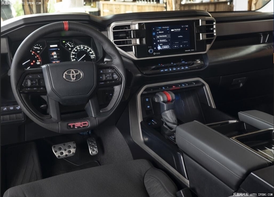 内饰方面,新车的设计刷新了我对日系车的印象,配全液晶仪表+大尺寸的悬浮式中控大屏,科技感十足;而且还有运动感十足的四幅式方向盘、推进式换挡杆以及活力四射的双色内饰搭配,很难想象这是一辆硬派越野皮卡。另外,新车将会配备TRD Pro座椅刺绣。