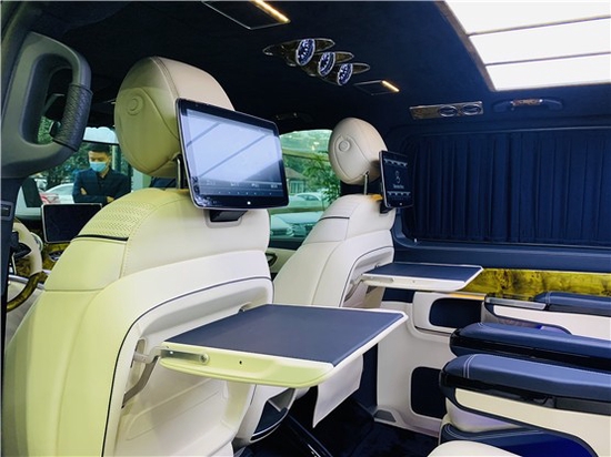 本台奔驰圣母峰是无隔断设计,在正前方有三块专门为我们奔驰圣母峰所定制的钟表,它们分别代表了时间、温度和湿度,您只要一抬头就能一览无遗。而且钟表的设计,能够一定程度上代表着品味和价值,就像男士都喜欢拥有一款很有价值感的名表,它不单单是用来看时间的,更多的是代表着你的品味。奔驰圣母峰中间头枕后是娱乐屏,支持USB,支持移动WiFi。只是分辨率一般。下方是两个祝福驾驶靠背桌板,很实用的一项配置。