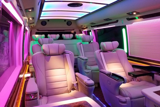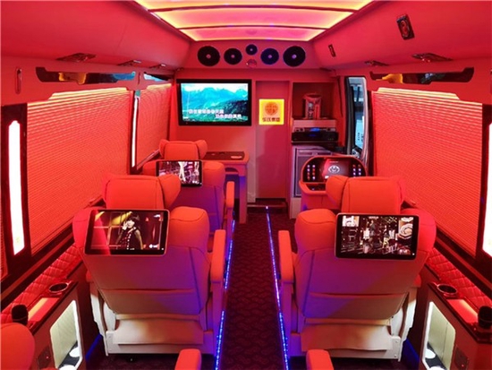 丰田考斯特改装商务车在灯光的设计上更是展现出了色彩的绚丽。A380航空彩色顶灯,不同的色彩设计展现出不同的氛围。阅读灯的安装为我们的阅读或者办公提供方便。通道地毯两侧的压条以及蓝色灯光的点缀,华通丰业考斯特改装商务车的内饰环境因缤纷的色彩更加尊贵。
