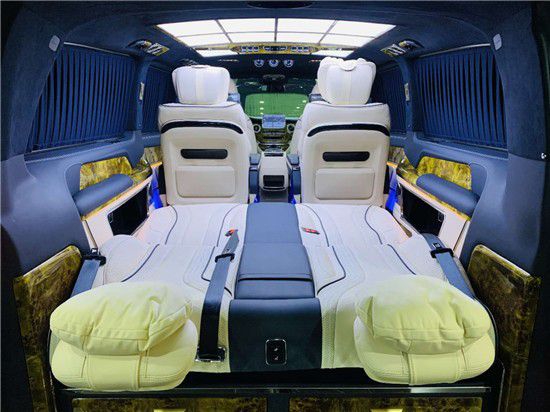 接下来我们进入这台奔驰V260L改装平顶七座圣母峰版商务车的后舱看看,第三排座椅是类似于沙发床的设计,带有前后电动调节,靠背可以一键实现躺平功能,这样的话长途乘坐的时候车主可以在车内睡上一觉,并且第三排也配备了通风和加热功能。