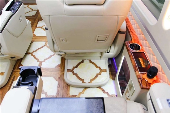 丰田考斯特车厢内置豪华办公桌、电动与手动旋转座椅、电动及手动秘书桌、豪华电动窗帘、日本车载冰箱与外装饰,DVD音响与电脑系统、全车地毡等。每个座位还可以配给电动按摩、调节加热系统、耳机插座、麦克风插座、LED高亮度阅读灯等等一应俱全。
