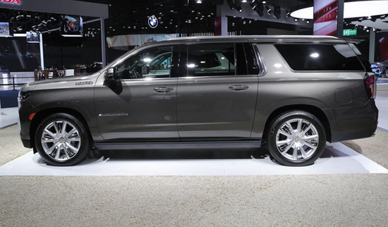 新款雪佛兰suburban外观造型设计还是以方正风格为主,车头横纹镀铬进气格栅气场不输凯迪拉克凯雷德,两侧更狭长的LED矩阵大灯光源很犀利,搭配小獠牙日行灯装饰,车头侵略感比较强。车身侧面属于很明显的全尺寸SUV身材,新一代产品比老款车型轴距增加了105mm,C柱后方超大面积侧窗与凯雷德如出一辙,搭配隔音隐私玻璃和平坦的车顶行李架,沉稳的气场很突出。