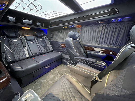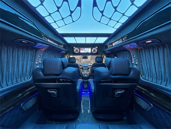 最舒适的当然是最为舒适的,中排座椅采用的也是首长级的航空头等舱座椅,带电动按摩、旋转、通风、加热等八项舒适性调节功能。也进行了菱形打孔设计,通风加热功能得到了提升,也更加舒适。地板采用的是亚克力高光镜面地板,更加美观档次十足,更容易打理。顶部前方采用了28寸半隔断电视,下方小吧台带触控屏灯光的一键控制,非常便捷,正副驾驶座椅后方配备了独立的办公桌板,更好地为您提供办公用途,米色的超纤真皮与橡木的点缀,无时无刻都在彰显他的豪华非凡,车顶覆盖天使之翼光纤顶灯和意大利进口Alcantara麂皮,整车覆盖超纤皮革。整车配备防震棉和隔音棉。