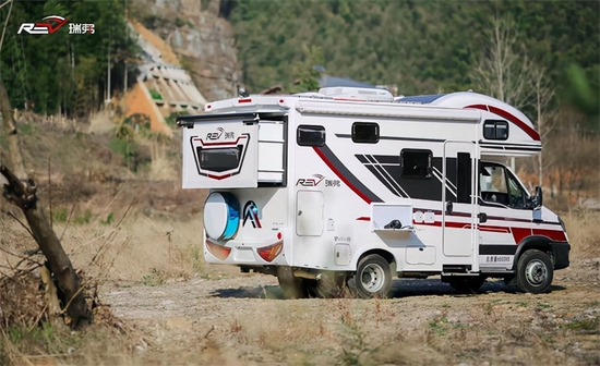 车身外观方面,为了区分现款4.5吨V820房车,6.5吨级瑞弗V820房车的外形装饰条采用了全新设计,深灰色和红色相结合,贯穿额头部分,中网部分则贯穿整个厢体部分。外形尺寸为5995×2495×3280(mm),6.5吨承载力底盘和4.5吨承载力底盘最大的不同在于后桥的承重能力,6.5吨底盘后纵梁是18cm,比4.5吨底盘的12cm加宽了6厘米,承载能力增强。另外,后胎的单个胎宽也升级为225mm,所以更沉稳一些。