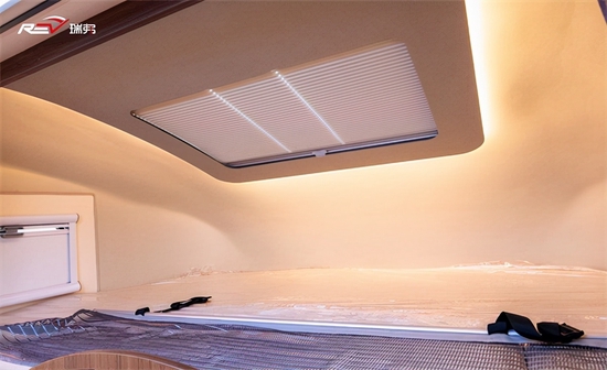 6.5T瑞弗V820的内饰和4.5T车型内饰基本上类似,还是以深色板材饰面为主,搭配暖黄色氛围灯。新车继续保留后行车空调出风口的设计,前方是双人额头床、中部是会客区和厨房区,车尾是一张可拓展的双人床位。新车相比旧款4.5T车型做了升级优化,更适合新手用户使用。