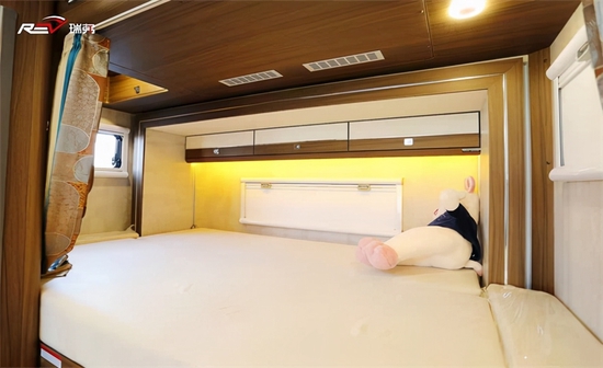 6.5T瑞弗V820的内饰和4.5T车型内饰基本上类似,还是以深色板材饰面为主,搭配暖黄色氛围灯。新车继续保留后行车空调出风口的设计,前方是双人额头床、中部是会客区和厨房区,车尾是一张可拓展的双人床位。新车相比旧款4.5T车型做了升级优化,更适合新手用户使用。