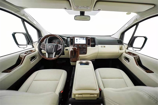 丰田(进口)海狮-HIACE驾驶舱升级9寸导航,搭配360度全车影像,红木方向盘,升级了原厂桃木纹内饰改为进口红木,豪华感顿显。主副驾驶座椅真皮包覆,主副驾驶座椅四向电动调节带通风加热,主副驾驶中间升级车载扶手冰箱。丰田(进口)海狮-HIACE主副驾驶后面,加装了24寸高清液晶电视娱乐系统,全车升级阿尔派音响系统。加装了隐藏小桌板,可承重10公斤!