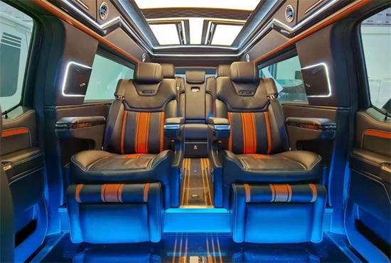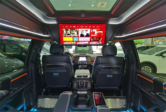 福特勇猛者是改造后的,原本只是承载货物的空间变成独立排布带电动加热按摩功用的第二排老板座椅和超大空间带顶灯独立空调出风口的第三排沙发。难得的是第三排座椅还能前后移动放倒!当不需求乘坐7人的时分,放下第三排即可恢复皮卡本身超大载货的空间优势。后排由于非承载式车身的关系会比前一二排略高,但得益于勇猛者的后车窗和全景天窗,并不显得局促,反而让乘坐于第三排的乘客会有种居高临下的觉得。