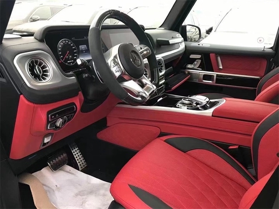 21款奔驰G63内饰方面其实才全新一代G级最大的变化。新车换上了奔驰最新家族式的内饰设计,这无疑让G级拥有了旗舰机应有的豪华感,不过经典的副驾驶席扶手和三把锁的开关键依旧延续了经典设计,并设置在中控台最显眼的位置。其中双12.3英寸高清屏,虚拟仪表盘与中控液晶屏融为一体,视觉上形成一个宽屏驾驶舱,中部的涡扇式空调出风口也颇具设计感,还大量采用了皮革的包覆。另外,新一代G级还对驾乘空间也进行了优化。