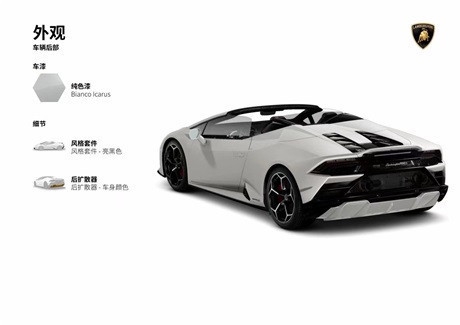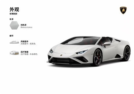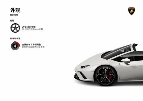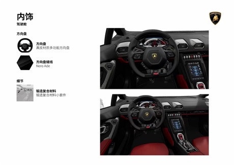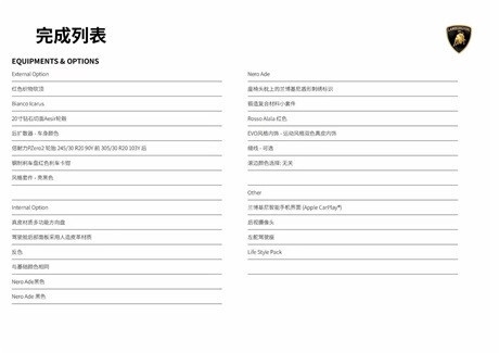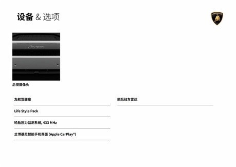 配置:20寸钻石切面Aesir轮毂,红色刹车卡钳,风格套件-亮黑色,EVO运动风格双色真皮内饰,真皮材质多功能方向盘,座椅头枕上的兰博基尼盾形刺绣标识,兰博基尼智能手机界面(Apple CarPlay),后视摄像头,生活组件。