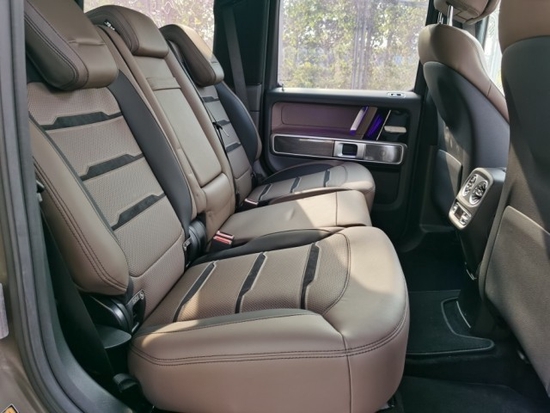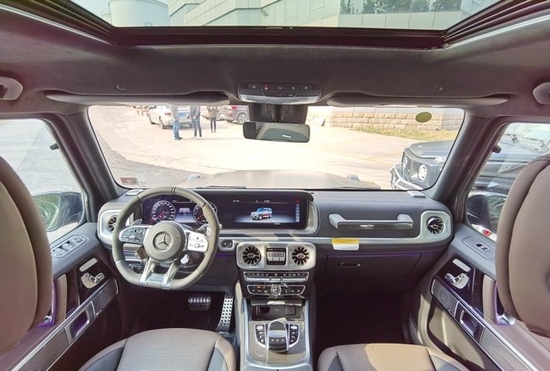 2022款奔驰G63豪华精致的真皮包覆提供了足够的舒适性和支撑性,通风和加热功能让乘客免受高温和寒冷的煎熬。中控台多处均采用碳纤维材料覆盖,带彩色TFT显示屏的AMG仪表盘、AMG主菜单和单独的挡位显示器以及采用白色照明的AMG门槛。名贵的选材及精湛的内装令人拍案叫绝。