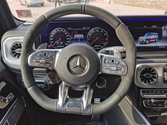 2022款奔驰G63中控台较为引人注意的就是空调口的设计,设计师称设计灵感来源于发动机的涡扇,带来了动感的造型以及富含力量感的气势。全新造型的平底式AMG运动方向盘战斗力十足,其两侧还配以打孔皮质包裹手感绝佳。