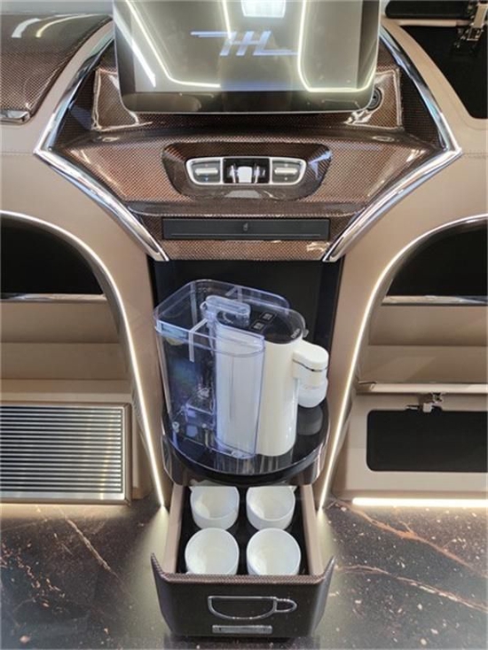 奔驰v级 (配置|询价)的车型在奔驰的所有车型中,它的安全系数都是有一定的保障,特别是驾驶电子辅助功能更是多了很多。对于一款全隔断的车型来讲,最主要的呢就是我们的商务舱。这台的隔断突破了以往的局限性,它采用的是最上方的电视机,中间的升降和雾化,玻璃和最下面的吧台共三部分所组成。最上方的电视机是可以连接车载无线WIFI,能正常的看电视,听音乐,或者是手机投屏,这也是非常方便,我们后排的乘坐者偶尔在车上办公开视频会议。中间的是一个雾化玻璃,它是可以上下升降的,一方面,当我们需要看前方的时候,当隔绝声音的时候,我们就可以把雾化玻璃打开,同时,升降下去的话,还可以随时随地的和我们驾驶舱的人员保持联系。最下方的吧台功能性也很强大,中间是有旋转的咖啡机,最下方的还配有四个咖啡杯,不管是个人在后排的休息,还是多人在后排的休息,这个吧台的作用就考虑的很到位。