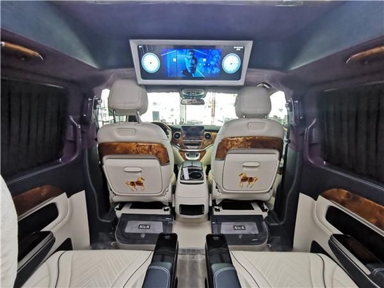 内饰采用加拿大雀眼枫木搭配、还有石英水晶航空灯克蒂定制钟表、无线充电系统、进口羊绒地毯配置,而且还有磨砂铝踏板 钢琴烤漆加手感漆等不管是材质还是设计都只是为您提供最好的。丹麦柏林之声5.1环境音响,3色的可调式迈巴赫宫弧形水晶顶灯也让后舱的豪华感更加的丰富。线条分明,电动隐私窗帘,车里就是您的私人办公室。