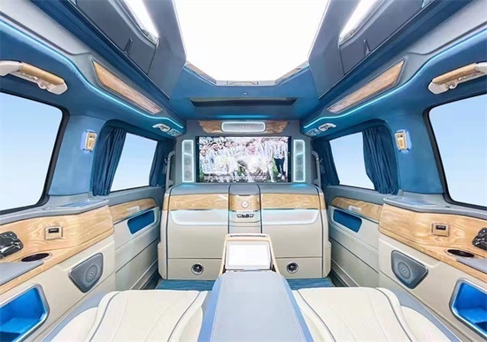 奔驰商务车奔驰V260L改装全车包覆意大利DINI真皮,搭配了ALCANTARA灰麂皮绒。米奔驰V260L改装它营造出整车内饰的寂静气氛,改装高顶浩瀚星空版同时使用具有闪光感的金丝线穿插在暖色内饰中,使奔驰V260L改装活跃了气氛,增添了些许生动。同时星空顶造型的加入,使得整个韵味涌现明朗与安详。