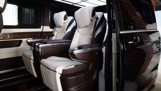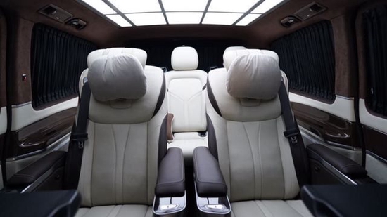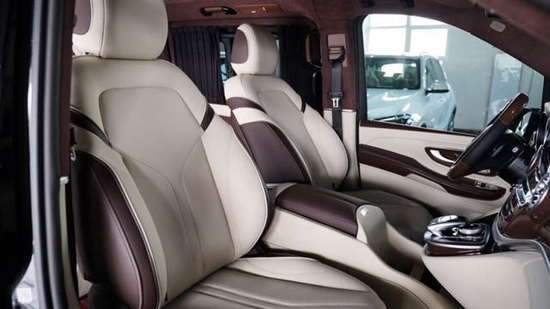 进口奔驰V250加长版前排乘客侧的后排乘客即使在长途行车中也能够完全放松。仅需按下一个按钮,便可将座椅设置到舒适的角度,最大倾斜角度为43.5度。一个附加的伸出式腿部支撑进一步增强了舒适性。配备电动可伸出式脚踏板时,能够创造出一个适合睡眠的舒适座椅角度。