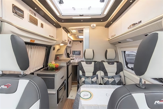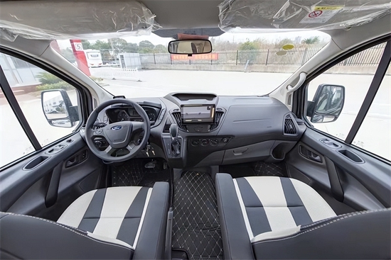 内饰布局方面,这款福特新全顺B型房车采用的前面客厅+中间厨卫+尾部横床布局,座椅布局则是主副驾驶座椅+单排双人座椅,4人座位;座椅配色采用简单、经典的黑白色,而家具板则采用浅色内,居家生活风格中又带一些商务气息,可谓商旅两用。