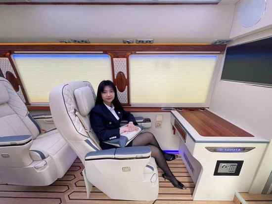 在车内不仅升级了蒙娜丽莎电动座椅,舒适性极高,座椅还可以移动,搭配可拆卸的小桌板,形成移动的会客厅。不仅可以在车内对坐开会,也可以在车内娱乐休闲。车内升级KTV娱乐系统,升级丹麦丹拿音响,可以在车内尽情唱K娱乐。48升冰箱,3升饮水机和酒柜随时为乘客提供各种饮水需求。