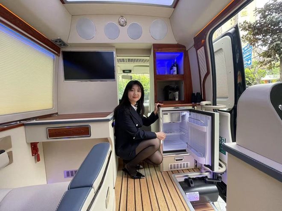外观黑色深沉,内饰豪华温馨,整车纳帕皮包覆,搭配缅甸红木红云祥木雕花吊坠装饰,让整车内饰更有韵味。车外刚强,车内沉淀,符合大佬气质和气场。再加上车内电动调节升降隐私窗帘,让整车气场再上一个档次,内部私密性极强,车内还有电动格栅门,分隔后舱和驾驶室,让后舱形成一个移动的私人休息室。