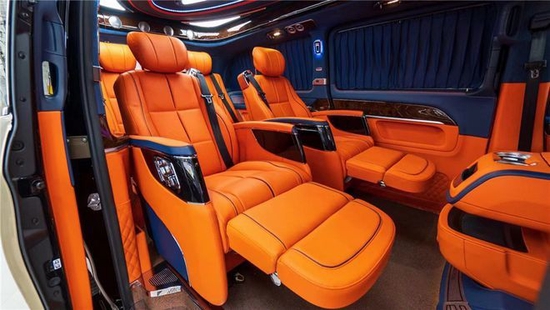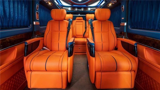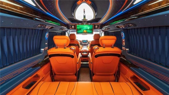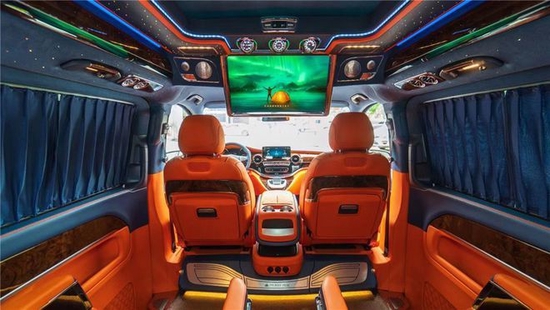 让您花低的价钱来享受一台最高端的奔驰迈巴赫也绝对有面子 威霆改装后还配有车厢内的灯光设备,按下按钮,车厢内顿时充满了黄色的炫彩灯光气氛以及漫天星晚上给人看星星的感觉。中控安装了14.1寸显示屏到时影响更加清晰可见还可以休闲娱乐,以及正副驾驶后面的商务桌板给了商务以休闲的功能,后面两个娱乐显示屏可让乘客更加休闲娱乐,商务人士可在会议过后利用车厢的灯光设备等,顿时让氛围轻松起来,可商务可休闲。吸顶电视设计使得车厢给人娱乐休闲的感觉,满天星顶会让您夜间行车抬头仰望,也让人有浪漫的星空臆想念头。倘若把周围的窗帘都拉开,闭上眼深呼吸,感觉与周围的环境很是融合,给人以心旷神怡的完美感