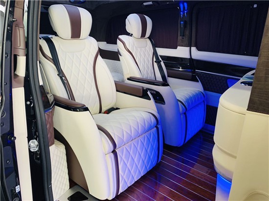 奔驰VS900后排采用宽大的双人联排座椅,带中控屏的多功能隐藏式扶手,可调控座椅的靠背和坐垫的前后移动,支持180度平躺,全景天窗开启,享受蓝天阳光,与商务舱柏林之声音响完美结合,商务旅途中十分惬意。