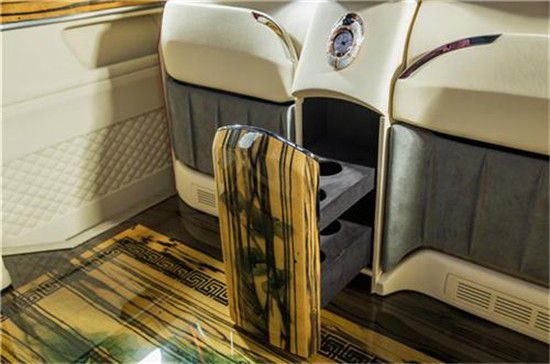 前吧台座椅中心镶嵌了英国进口钟表,表盘周围镶嵌588颗锆(gao)石,散发出来的光芒引人注目,极具奢华感。艳丽的红宝石点缀蛇眼,衬托整体造型的灵动感。黑玛瑙与红宝石相映成趣,色彩对比非常醒目,装饰定制珠宝的杯托和时钟,都成为定制款精湛技艺和艺术造诣的完美呈现。可以说是国内前所未有的超级豪华商务车型。