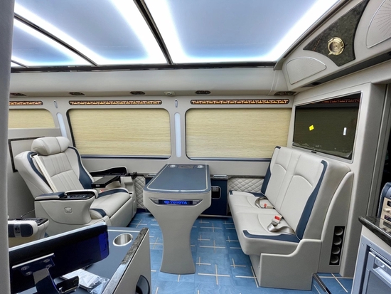 从内饰的改装上来说,这就有很多细节的设置了。从灯光的设置上就有很多种方式,我们可以在车顶内加装豪华的彩色灯,可以有橙色蓝色紫色等不同的灯光选择,营造车内氛围。窗帘内侧可以加装LED蓝色灯光,车内立柱加装LED灯光,台阶上也可以镶嵌LED灯光,显示品牌坐标等。同时还可以在通道来两侧增加LED蓝色灯光。我们都知道,光是最能衬托氛围的选择,对车内灯光的改装可以带给我们独特的视觉感觉,营造出或温馨或者淡雅的乘车环境。