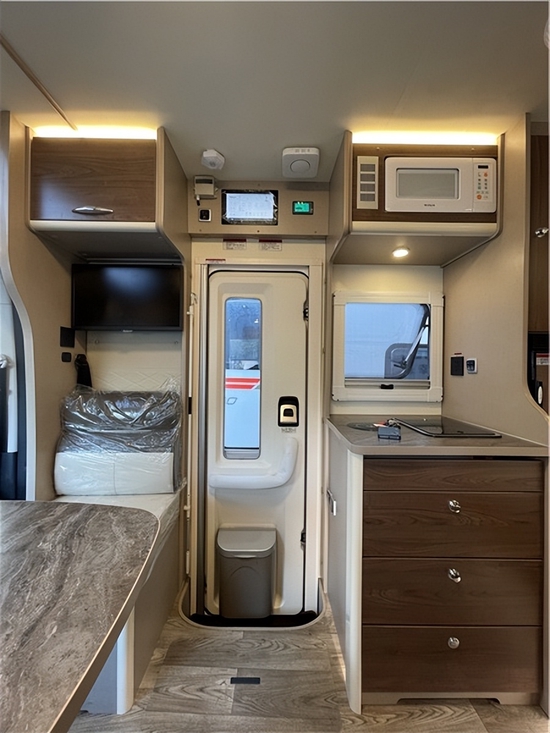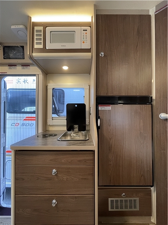 驾驶舱与后方生活区贯通式过道的设计方便了日常进出,生活区的厢体采用房车专用厢板,内饰方面则选用了房车专用家具板材+126M地板革,保障内部居住舒适度,有效提升保温隔热降噪的性能;