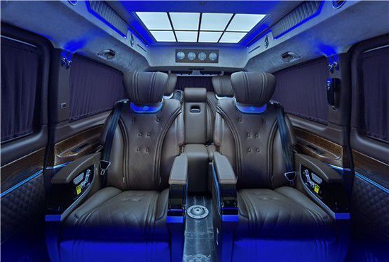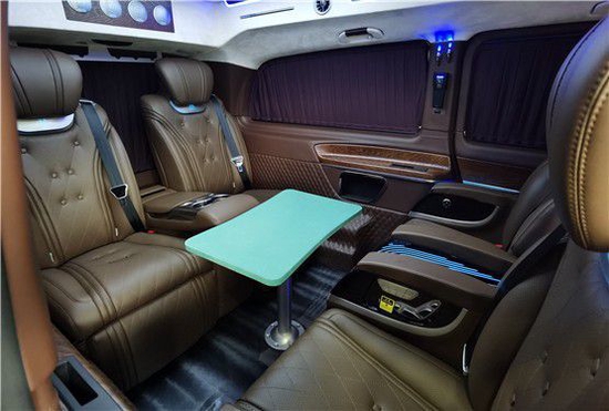 奔驰V260L七座版改装商务车高顶隔断礼遇版,七座车型的第三排沙发,支持一键放平或者收起,随时为您的长途出行打造足够宽敞舒适的卧铺,简约时尚的氛围灯与豪华柚木地板交相辉映,是对精致移动生活的皮质追求!