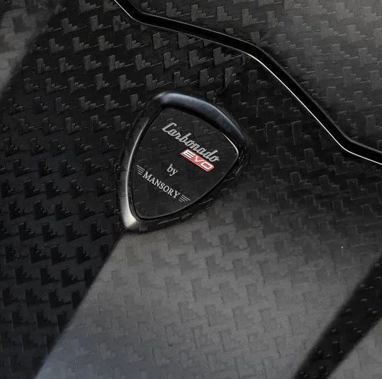 锻造碳细节展示1:印有MANSORY飞翼标识和Aventador EVO的碳纤盾徽充分显露了这台“大牛”的卓尔不群。