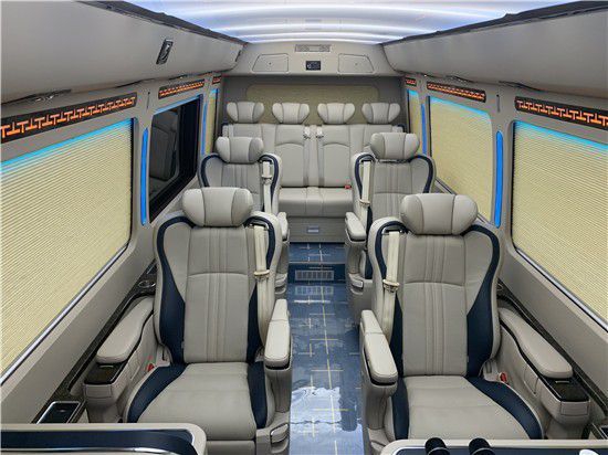 从内饰的改装上来说,这就有很多细节的设置了。从灯光的设置上就有很多种方式,我们可以在车顶内加装豪华的彩色灯,可以有橙色蓝色紫色等不同的灯光选择,营造车内氛围。窗帘内侧可以加装LED蓝色灯光,车内立柱加装LED灯光,台阶上也可以镶嵌LED灯光,显示品牌坐标等。同时还可以在通道来两侧增加LED蓝色灯光。我们都知道,光是最能衬托氛围的选择,对车内灯光的改装可以带给我们独特的视觉感觉,营造出或温馨或者淡雅的乘车环境。