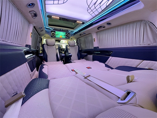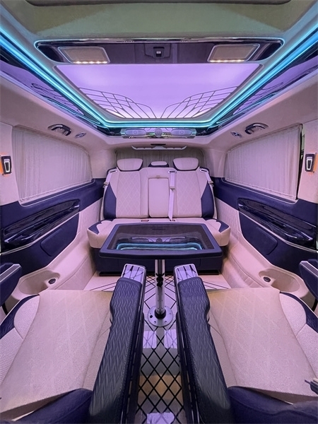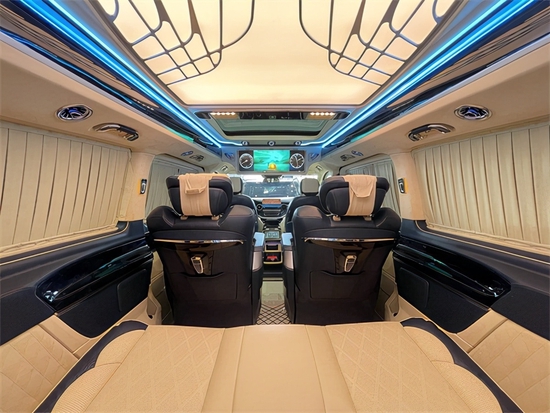 本款奔驰V260L商务车的顶灯部分运用的是迈巴赫圆弧形顶灯设计,材质采用美国进口石英水晶,通过镶嵌式总控进行控制,三色可变,保证了车内的充足照明,比如谈判的时候可以使用白光,陪同家人或者女朋友的时候可以使用暖光,聚会的时候可以使用蓝光,根据您不同的需求来调节光色。后舱玻璃处均配备了隐私窗帘,不用担心受到外界环境的打扰,一个车内的独立小空间就这样诞生了。您可以亲手触摸一下顶灯这个材质,它是冰凉的,因为它具有隔热防辐射的功能。