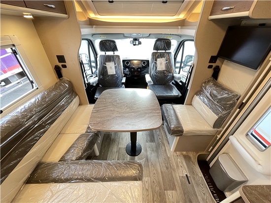 会客区位于驾驶舱后方,左侧设有L型沙发卡座,右侧则是一张单人沙发,中间配有雾白色可升降餐桌便于车上人员休闲、娱乐、餐饮时使用;沙发侧方分别设有220V带USB的五孔插座可用于平时给手机、平板等电子产品充电;