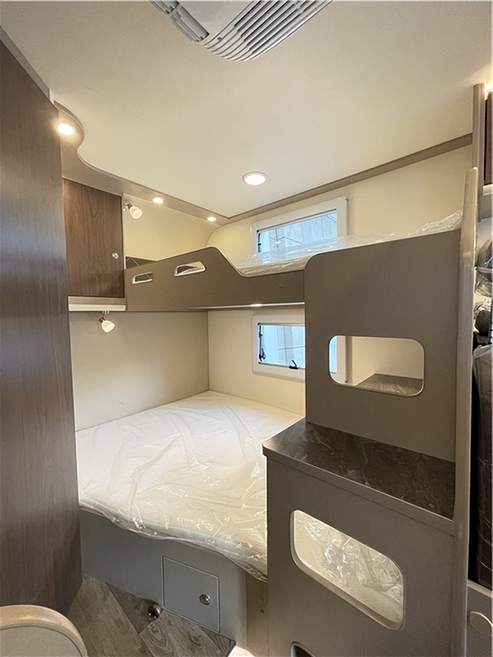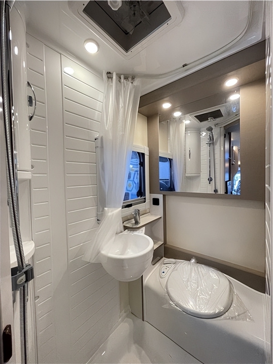 一体式卫浴间配置了Thetford盒式坐便器、双向换气扇、旋转式洗漱池、浴镜、浴帘、独立淋浴花洒、储物柜、置物台、毛巾架、防水插座等设施,充分满足车上人员的卫生需求;