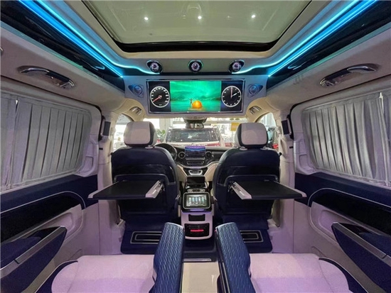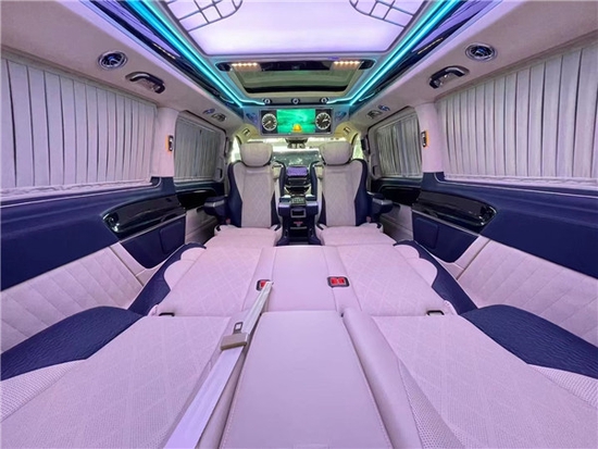 中排座椅转过来后可以形成小型会议室布局,中间有张隐藏式办公桌板瞬间满足会议使用需求,在平时还可以拼成一张简单双人床,这样也可以满足不同人群在旅途中休息需要,这是一款多功能商务房车,车辆上半部分配有进口阿尔坎塔拉皮绒,整体效果更加清新,时尚。