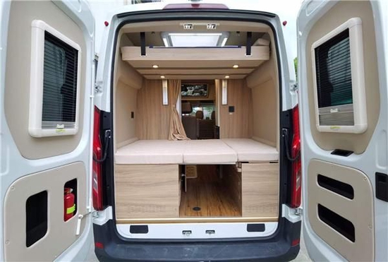 尾部后横床下铺尺寸为1.85*1.245m,配备抽拉式铝合金后床骨架,可轻松睡下两人。如果将下方床垫翻折,可腾出1m多的储物空间;上部升降床为1.7*0.9m,加备两侧防护网。