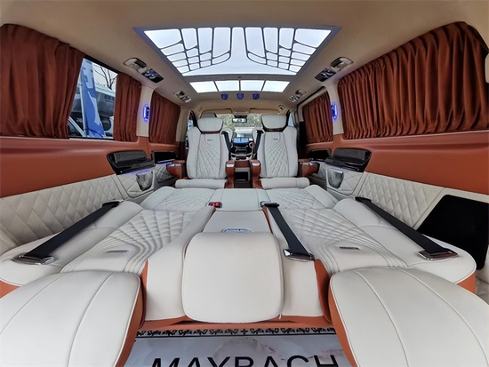 不管是接待还是旅游,能很适用。顶部搭配层次分明的光纤灯,配上繁星点点的满天星和横条灯带,即梦幻又高级。一切的搭配都只是为您展示这款奔驰威霆巴赫版的奢华与不凡。同时本款威霆高顶7座高端私人定制改装商务车,不仅在视觉上还是触觉上都能让乘坐者感到身心愉悦