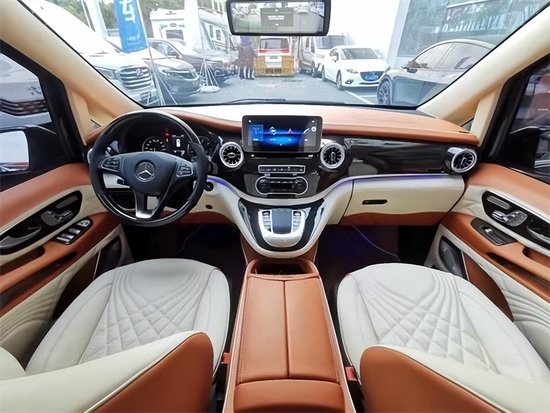 车内采用更加温馨舒适的暖色调的超纤真皮包覆,观赏性,豪华性,十分出色。多功能方向盘采用双拼色的超纤真皮包覆,搭配迈巴赫的标识,握感以及档次感十分高。同时全新升级一键启动,中控部分也采用的是奔驰V级 (配置|询价)同款的中控设计,科技感十足。