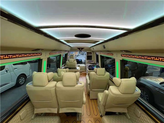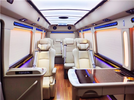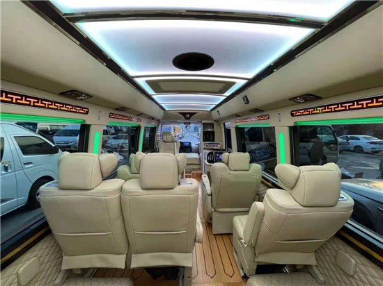 丰田考斯特15座改装商务车,所能体现的美观和大方的设计不仅仅在于车身的米黄金色的高贵,也不在于所增加的彩色中线的灵动,虽然酷炫的车头设计能够得到人们的一声赞叹,但是这些都无法和丰田考斯特15座内饰的优雅设计和舒适改装相提并论。丰田考斯特15座改装商务车,在内饰的设计上不仅仅是美轮美奂更是将舒适与高贵完美的融合在一起。