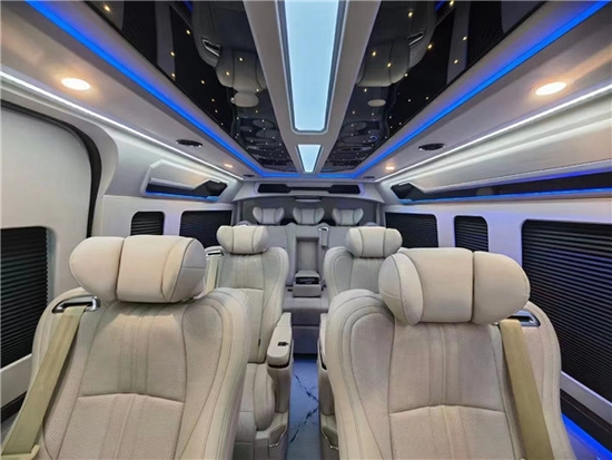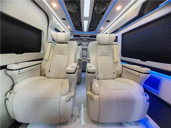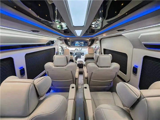 全车采用了四张触控屏控制的航空座椅,座椅构造更符合人体曲线,令旅途行车倍感舒适,同时座椅均带通风、加热、按摩,座椅侧方贴心设计了多功能调节按钮。头顶前方配备宽阔的网络电视,调节座位角度 使车内变成移动的电影院!
