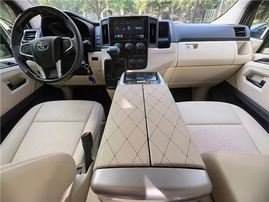 丰田(进口)海狮-HIACE驾驶舱升级9寸导航,搭配360度全车影像,红木方向盘,升级了原厂桃木纹内饰改为进口红木,豪华感顿显。主副驾驶座椅真皮包覆,主副驾驶座椅四向电动调节带通风加热,主副驾驶中间升级车载扶手冰箱。丰田(进口)海狮-HIACE主副驾驶后面,加装了24寸高清液晶电视娱乐系统,全车升级阿尔派音响系统。加装了隐藏小桌板,可承重10公斤!